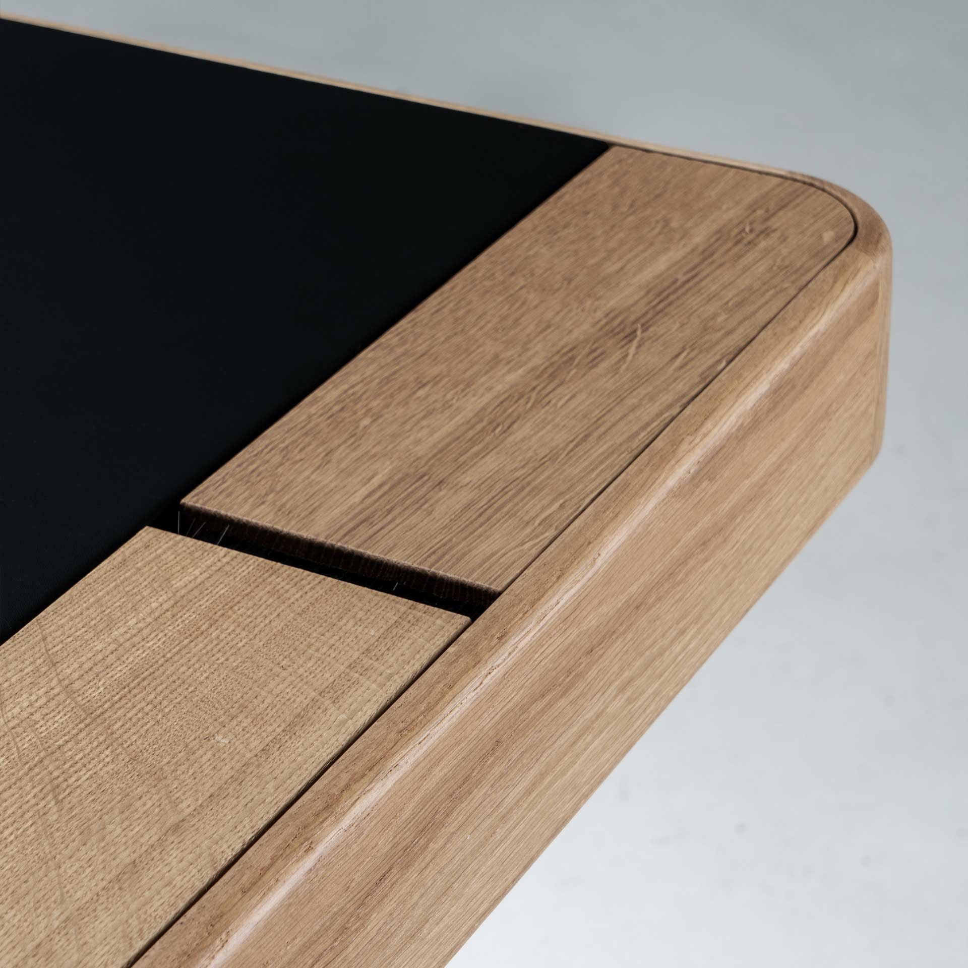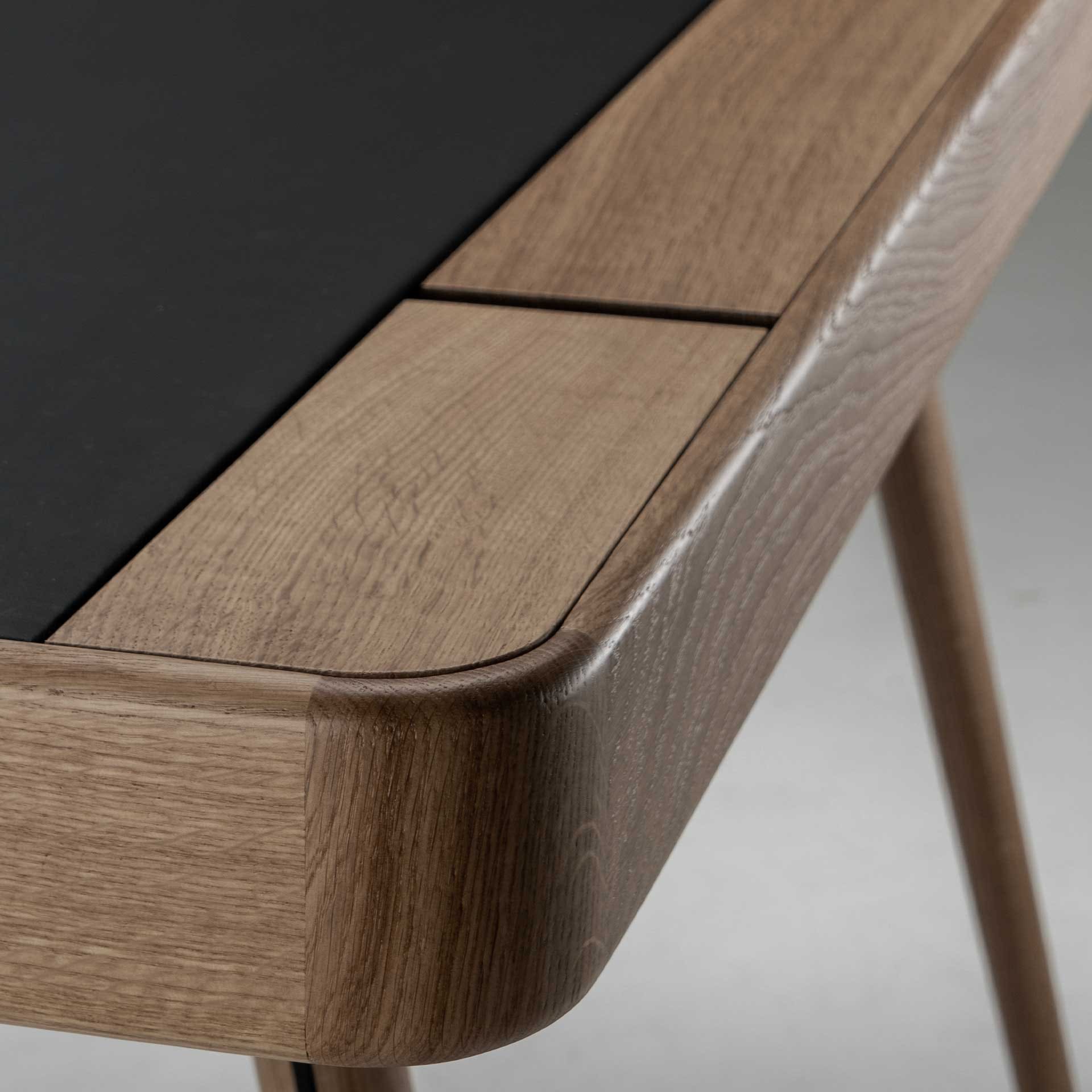 Если хотите, чтобы ваша рабочая зона в доме выглядела солидно, Вам обязательно понравится этот дизайнерский письменный стол. В нем удачно сочетаются оригинальный дизайн и практичность. Подстолье выполнено из массива дуба. Столешница из МДФ, отделанного дубовым шпоном с четко выраженной структурой древесины.